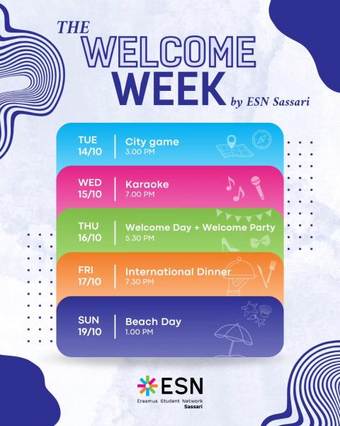 Mark your calendar: from October 14th to 19th, get ready for the most important and fun-filled week of your Erasmus in Sassari! We've put together an explosive schedule to kick off this adventure, create unforgettable bonds, and discover the city!